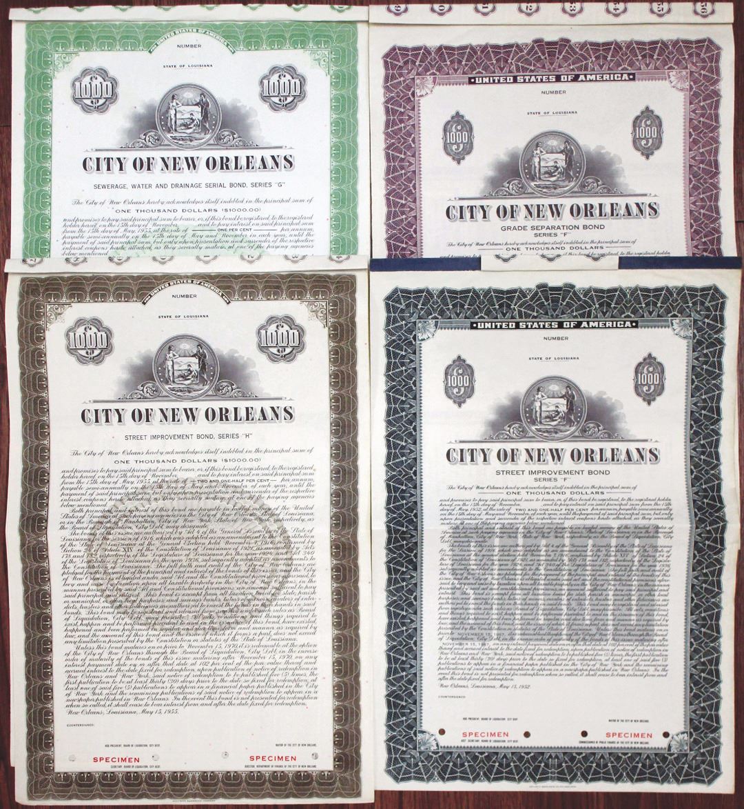 New Orleans, Louisiana. Lot of 4 pieces, all City of New Orleans: $1000 Specimen 2.5% Street Improvement Coupon Bond in brown; $1000 Specimen 2.5% Street Improvement Bond in blue; $1000 Specimen 2% Grade Separation Coupon Bond in purple; $1000 Specimen 1% Sewerage, Water & Drainage Serial Coupon Bond in green. All have red specimen overprints and are in Fine-VF condition. Printed by SBN. (4)