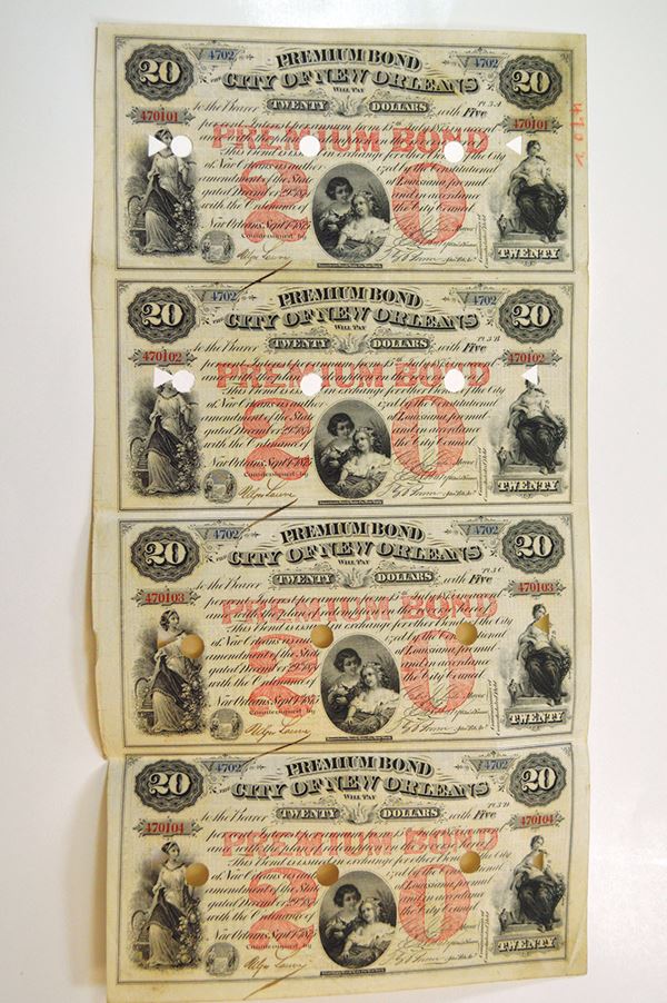 LA. $20-20-20-20. ABNC. Very Fine, folded between notes, poc's on each.
