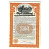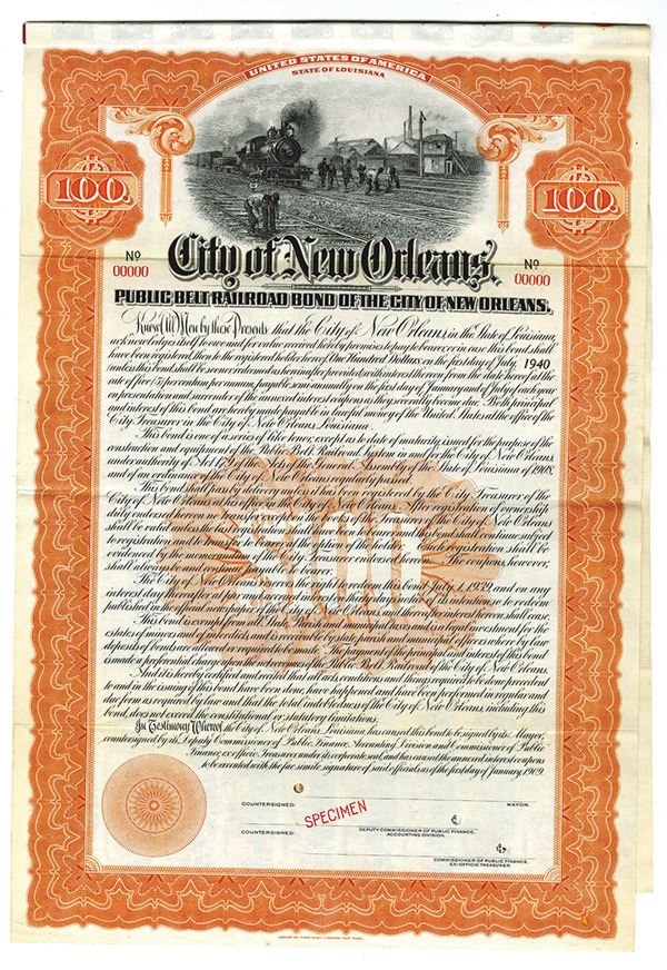 New Orleans, Louisiana. $100 Specimen 5% Coupon Bond, Black print on large orange border and under tint, Image of men examining railroad tracks with a locomotive coming up, Specimen overprints, POC's, VF-XF condition. ABNC.