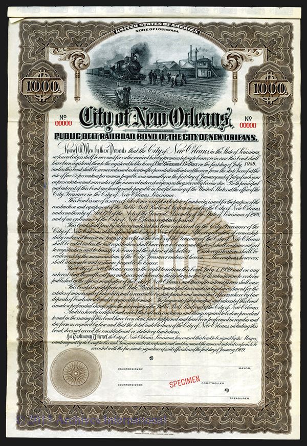 New Orleans, Louisiana, 1909, $1000, 5% Coupon Bond Specimen. Brown border and undertint. Track workers in train yard with train approaching L-R. Coupons attached. XF condition. Red specimen overprint and POC's. ABNC. Unlisted railroad bond in Cox.