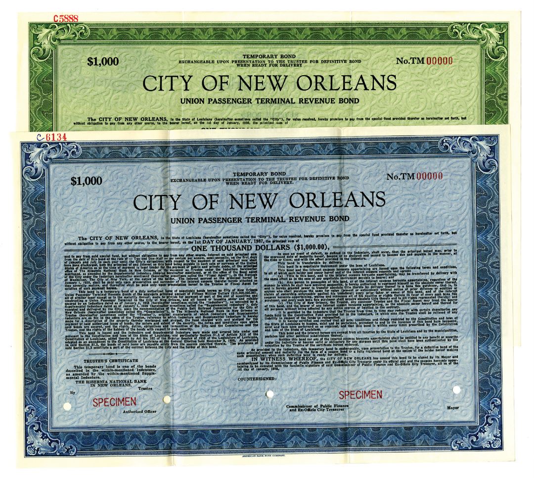 New Orleans, Louisiana, Lot of 2 bonds, both are $1000 specimen bonds with 2 coupons each, one bond green, the other blue, Specimen overprints, POCs. Rare modern bonds. ABNC.