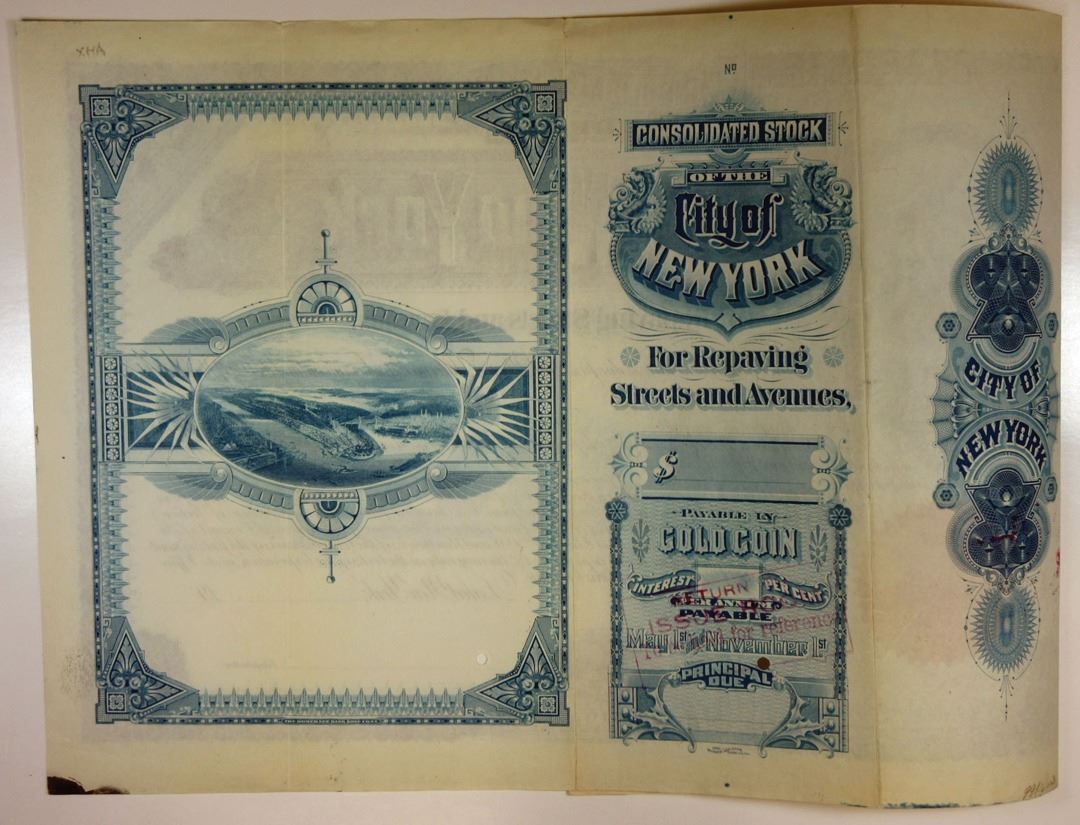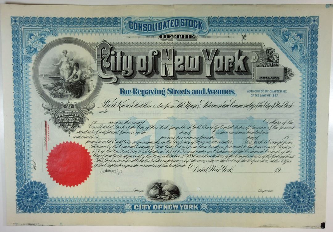 New York, ND (1900s). Specimen Gold Bond for Repaving Streets and Avenues, Black on blue border and underprint, Allegorical women together at left in circular frame with bag of coins at bottom, POCs, VF-XF condition, FLBNC.