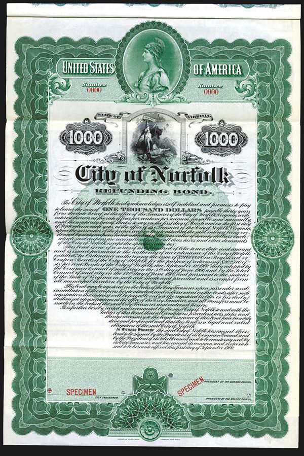 Norfolk, VA. $1000 Specimen 4% Refunding Bond, Black on green, Specimen overprints and POC's, VF, ABNC.