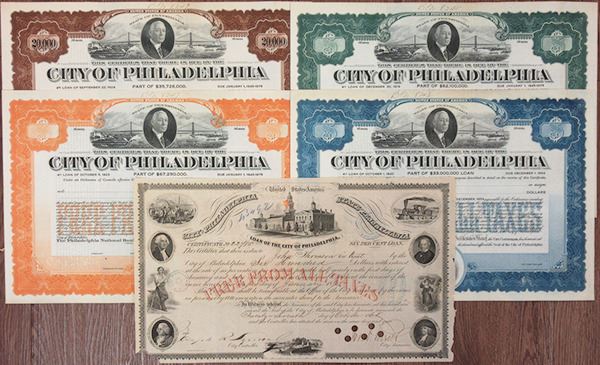 Philadelphia, Pennsylvania. Group of 5 Bonds, 1 is I/C with the balance are Specimens with one proof. The Specimen bonds were dated between 1920 to 1924. # of the bonds are $-Odd and one for $20,000. All with Liberty Bell on bottom and top with bridges flanking portrait of possibly the Mayor at that time. All are rare and printed by SBNC. The I/C bond is in Fine condition with damage to margins and missing bottom left corner. The specimens are XF-UNC condition.