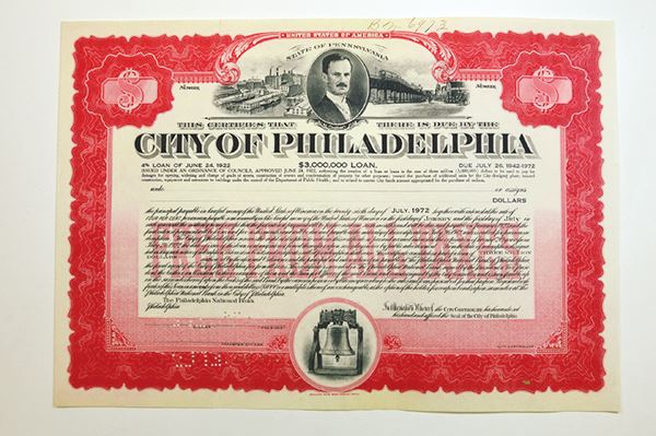 Pennsylvania. $-Odd Registered Bond Specimen. Harbor, Elevated Train and Liberty Bell vignettes. Security BNC. Extremely Fine.