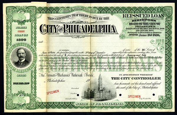 City of Philadelphia, Loan of 1898 Specimen Bond. Pennsylvania, ca.1900, $-Odd, Specimen Reissued Loan of 1898, 3% Bond, green border and underprint, with notable portrait at left, No Coupons, POC's, VF. ABNC.