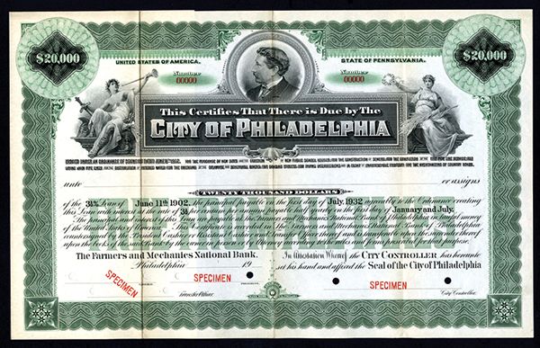 City of Philadelphia, Loan of 1902 Specimen Bond. Pennsylvania, $20,000, Specimen construction 3% Bond, green border and underprint, with notable portrait at center, No Coupons, POC's, VF. ABNC.