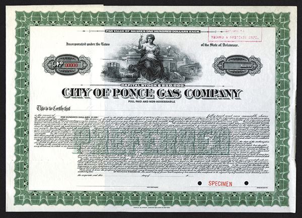 Southern Puerto Rico location. Green border, woman holds light bulb, streetcar and gas tank, shares of $100 each, FLB, ABNC.