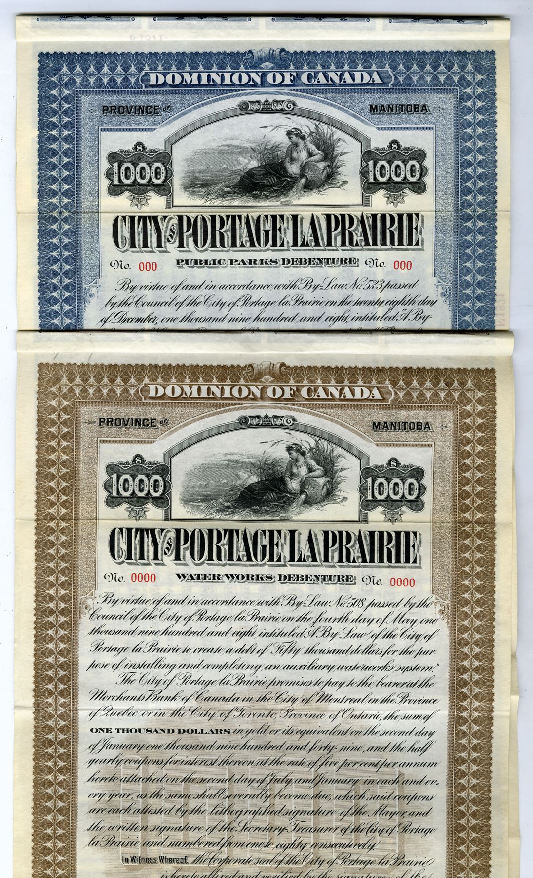 Manitoba, Canada, 1909. Lot of 2 Specimen Bonds: $1000 5% Public Parks Debenture Coupon Bond, Black on blue border and underprint; and, $1000 5% Water Works Debenture Coupon Bond, Black on brown border and underprint. Both pieces have the same vignette of an allegorical woman sitting by river, Specimen overprints, POCs, XF-AU condition, and were both printed by ABNC. (2). Sold "AS IS" no returns accepted.