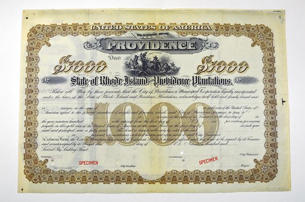 Rhode Island. $1000 Registered Bond Specimen. ABNC. Extremely Fine. Paper tone.