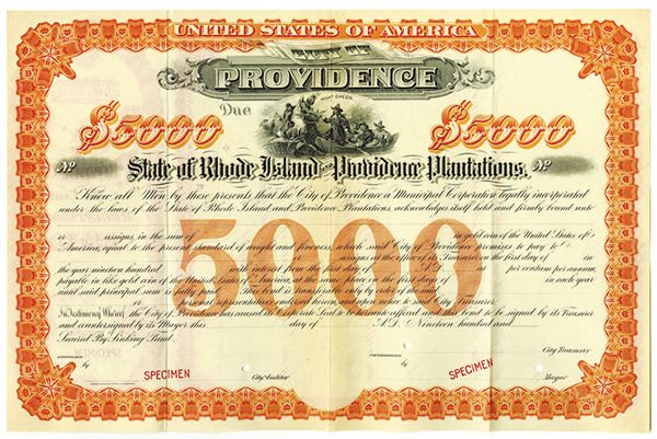 Rhode Island, ND (1900-10s). $5000 Specimen %Odd Registered Bond, Black text with orange border and underprint, Illustration of Native Americans greeting Pilgrims at top center. Red specimen overprints and POCs. Fine condition, ABNC.
