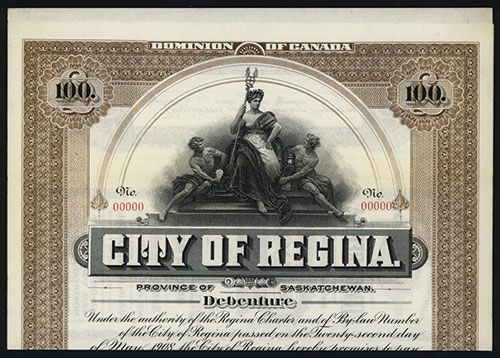 Saskatchewan, Canada. 1908, 100 Pounds Sterling Debenture. Brown border and underprint w/allegorical woman flanked by nude young men. ABNCo. Litho Ottawa specimen, XF. Scarce City bond.