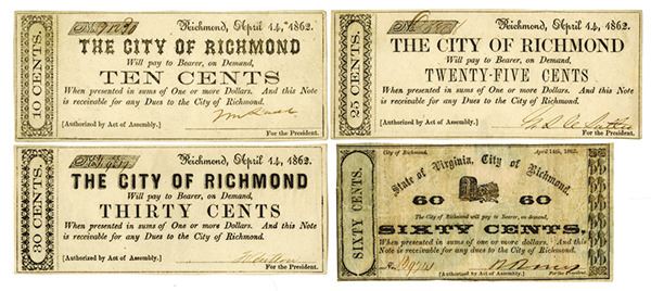 Richmond, VA, Lot of 4 notes, Includes 10cts; 25cts; 30cts and 60cts notes, all but the 60cts note are AU to Uncirculated, the 60ct note was printed on the back of a red and black obsolete banknote. VF.