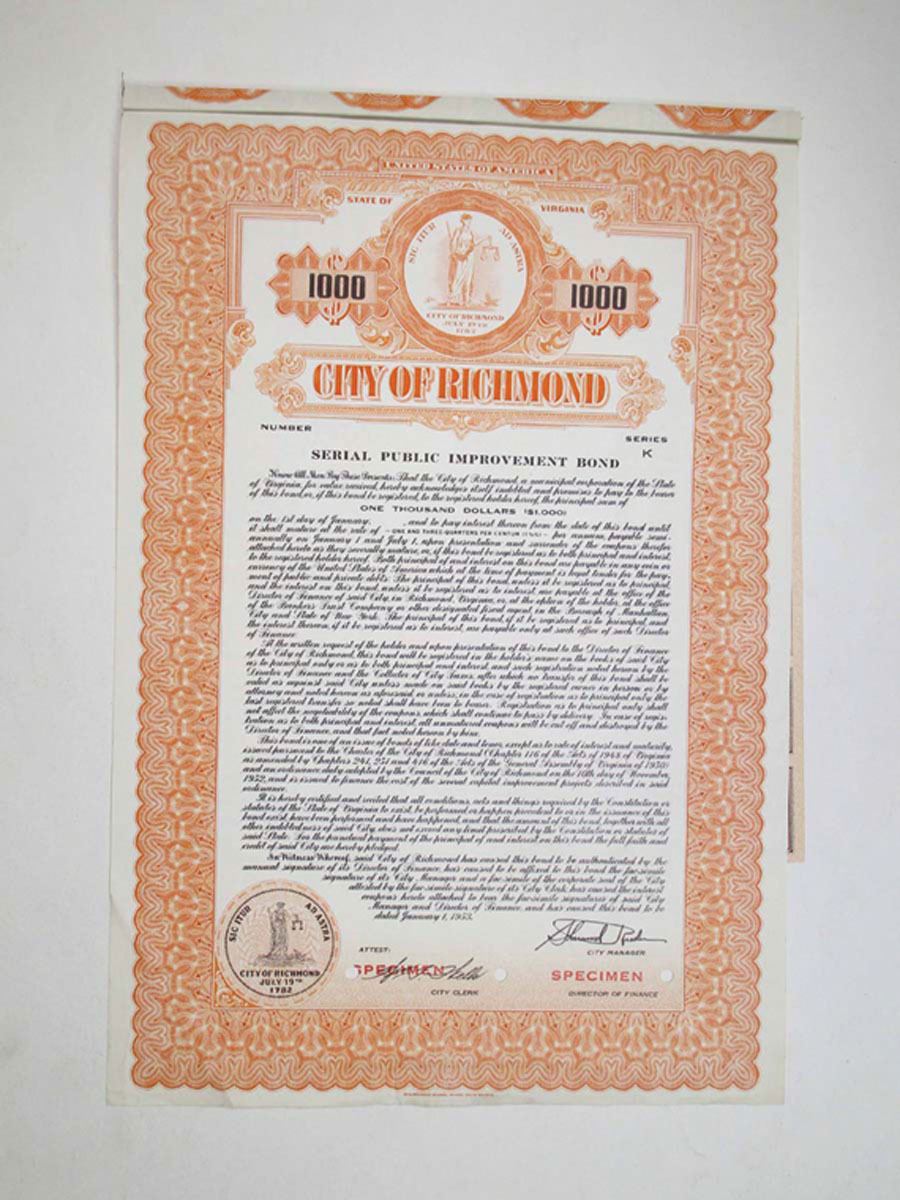 Richmond, Virginia, 1953. $1000 Specimen 1 3/4% Serie K Serial Public Improvement Coupon Bond, Black print on orange border and underprint with seal of Virginia at top center, Specimen overprints and POCs, XF to AU condition, HBNC.