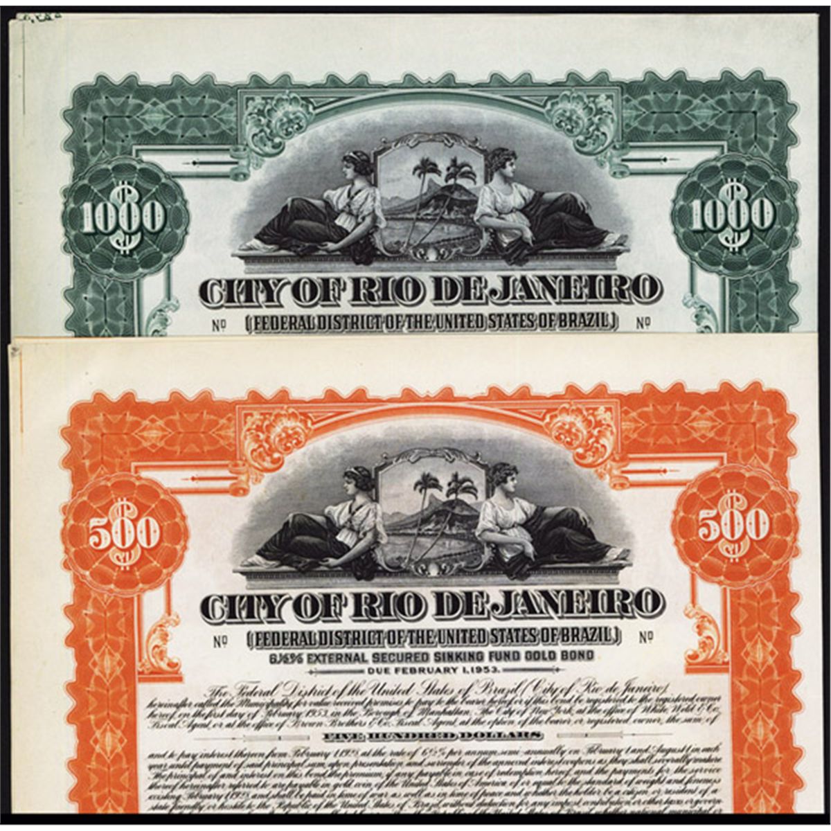 Rio De Janeiro, Brazil, 1928, Lot of 2 unmarked Specimen Bonds, Includes $500 and $1000 Bonds, Orange or Green, tropical view of Rio flanked by allegorical women, Coupons attached, arms at bottom. Both XF and scarce. Hamilton BNC.