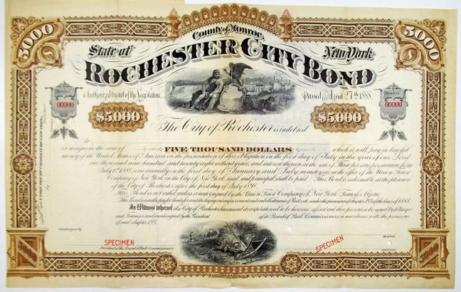 New York. 1888. $5000 Specimen 3% Rochester City Bond for Park Purposes, Black text with brown border, Man seated by Rochester city seal at top center. Red specimen overprints, 00000 serial numbers, and POCs. Fine condition with pronounced fold lines and small piece missing to bottom center, ABNC.