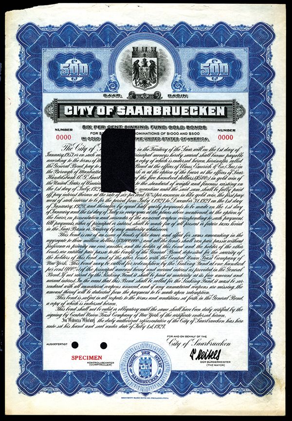 City of Saarbrueken, 1927 Specimen Bond with Proof Back. Saar Basin, Territory of Saar, Lot of 2 items, Includes 1927 $500 U.S., 6% Sinking Fund Gold Bond, Black on blue border and underprint, Arms of SAAR in middle, Specimen overprints, POC's and "0000" serial numbers, unfortunately, this bond was used in the design and production of another certificate so a portion of the text from the back panel was cut out which left a 1.2 inch by 2.5 inch hole in the middle of the bond text below the vignette, still extremely rare and the only example found in the archives. Also included is approval proof in brown of the back panel with all of the detail included. Fine condition other than the missing piece, SBNC. *The Territory of the Saar Basin (French: Le Territoire du Basin de la Sarre; German: Saarbeckengebiet ), also referred as the Saar or Saargebiet, was a region of Germany occupied and governed by the United Kingdom and France from 1920 to 1935 under a League of Nations mandate. Initially, the occupation was under the auspices of the Treaty of Versailles. Its population in 1933 was 812,000, and its capital was Saarbrucken. After a plebiscite was held in 1935, it was restored to Germany. (*Wikipedia)