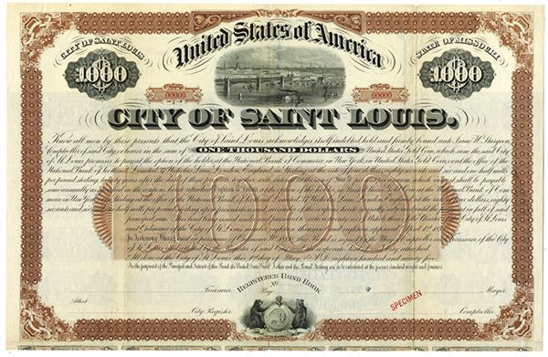 Missouri. $1,000 Specimen 3 65/100% Bond, Black print on brown border and under tint on horizontal format, Scene of Saint Louis at top, Specimen overprint and POC's, Fine-VF condition with splitting at center fold line. ABNC