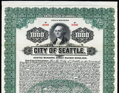 Seattle, Washington, 1919, $1000, Specimen 4% Seattle Municipal Street Railway Bond, Washington Portrait, Coupons attached, POC's, XF condition. Unlisted railroad related bond in Cox. FLD-ABNC.