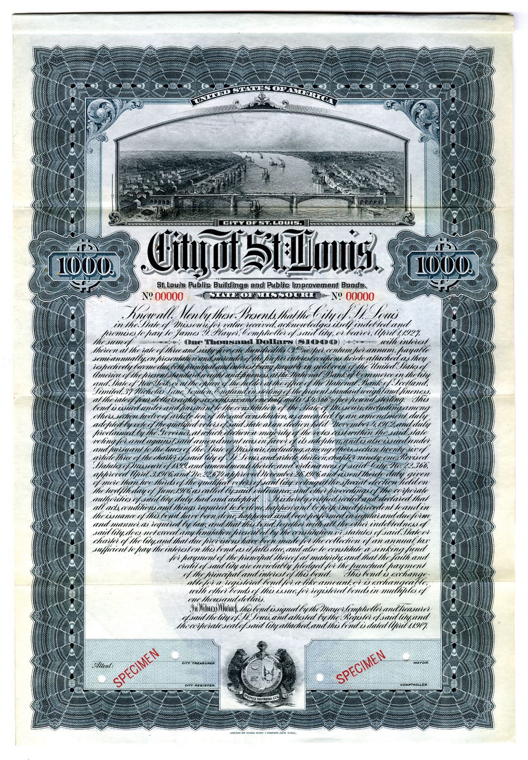 Missouri. $1000 Specimen, 3 65/100%, Public Buildings and Public Improvement Coupon Bond, Black print on blue/gray border and under tint, Arial view of St. Louis bridge with boats on water at top, Specimen overprints and POC's, VF-XF condition, ABNC.