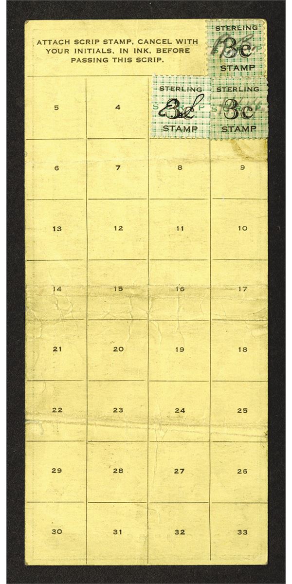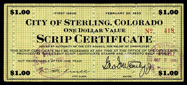 Sterling, Colorado, February 20, 1933, $1, (Ref: CO350-1) First Issue, Issued scrip or depression scrip with back with adhesive 3 cents (Revenue) stamp too be applied every time the certificate was to be used (this one has 3 stamps on the back, Black border and text on light checkerboard pattern green face, back with room for stamps to be applied, Cert.#418, 2 purple circular bank hand stamps (Cancellations or validations), not appears in Fine+ to VF condition. Scarce Colorado issue depression scrip.
