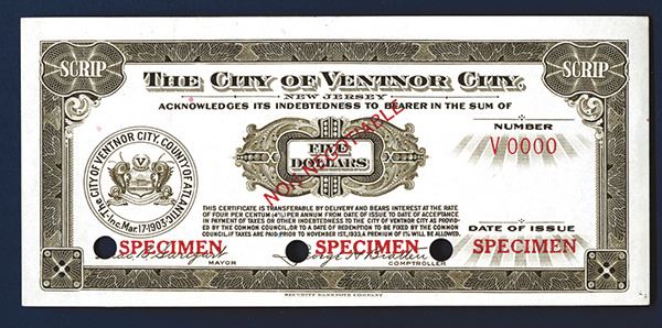 NJ. $5, Specimen, Brown, Specimen overprint and POC's, Choice AU to Uncirculated. Rare specimen variety. SBNC.