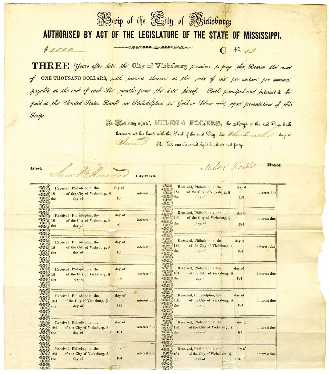 Mississippi, 1840. $1000 I/U 6% Scrip Certificate, S/N 12, Black text, Coupons attached at bottom. Fine condition with some toning, splitting, several small holes, and damage to right margin. Signed by Miles C. Folkes as Mayor of Vicksburg. Folkes served as mayor from 1840 to 1847, and again from 1858 to 1860. He was one of the earliest settlers of Walnut Hills, known as Vicksburg today.