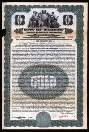 February 1st, 1928. Specimen bond. $1000, Green border and undertint. (Miasto Stoleczne Warszawa) Republic of Poland, 7%, 30 Year, Sinking Fund External Gold Bond of 1928. Allegorical women and nude children flank oval ornament. Written in English. Red specimen overprints, 00000" serial numbers and POC's. Coupons attached. Appears in VG to Fine condition with a small piece missing on the left top side, toning on edges, but their is extensive archival reinforcement of all of the folds due to the aging and potential separation of the paper at the folds. ABNC. Rare Polish specimen bond and one of two of this type found in archive. This bond is sold "As Is".