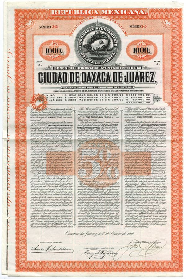Mexico. 1000 Pesos, 5% Issued Bond, Uncancelled, Black on red border, Young woman sleeping in middle top, S/N 345 in red, Coupons attached, Black on orange border and underprint, Portrait top center of a sleeping allegorical woman beside arrow and quiver, VF condition, ABNC.