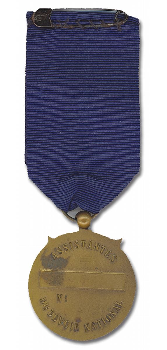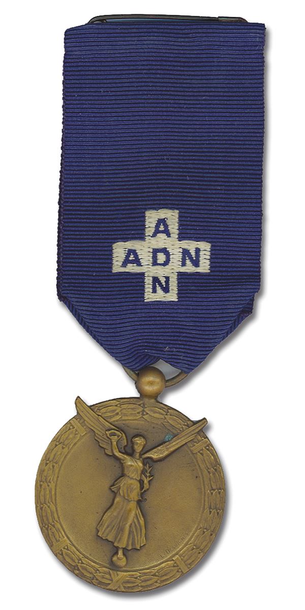 France, c. 1935 bronze, 35 mm on blue ribbon with "ADN" monogram in white cross. Winged female within wreath. Unengraved reverse. Uneven patina on reverse. Extremely Fine.