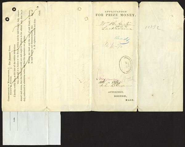 1864, Included is a claim by a Civil war sailor. William H. Austin, who served on the U.S. Steam Sloop the “Lackawanna”. During his term of service on the “Lackawanna”, they captured the following vessels: The Schooner “Sea Lion” on May 9, 1863; The Schooner “Hunter” on May 18, 1863; The British Ship “Neptune” on June 14, 1863; The Confederate Ship “Planter” on June 15, 1863. The documents go on to say that “Austin“…is entitled to share in the prize money occurring from the capture of said vessels.” A significant artifact of the War Between the States. Scarce in complete format, minor splits, archivally repaired.