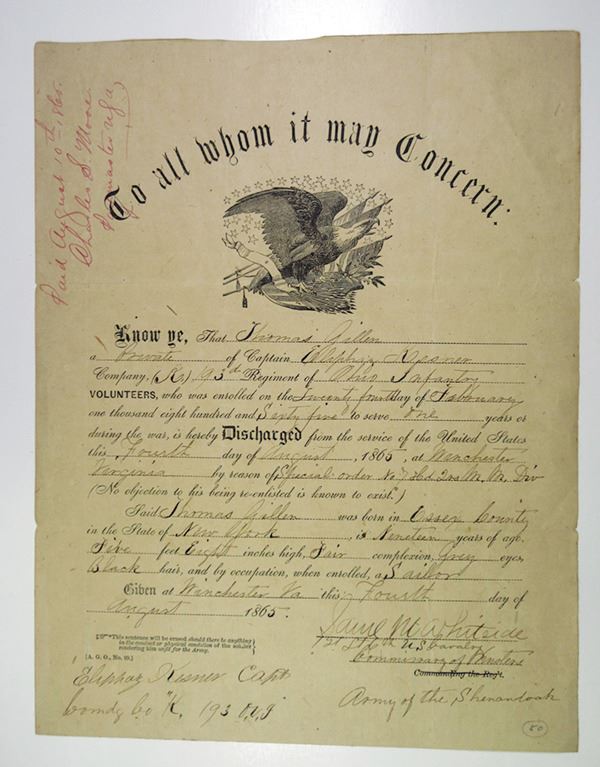 Ohio, 1865. Discharge paper for Thomas Gillen, a Private in the 193rd Regiment of the Ohio Infantry Volunteers during the American Civil War. Black text with a beautiful illustration of an American eagle at top center, red writing at top left corner. Document provides information about Private Gillen, who was nineteen years old, stating he was discharged in Virginia, and was a member of the Union Army of the Shenandoah. The 193rd Ohio Infantry was organized at Camp Chase in Columbus, Ohio in March, 1865, and mustered in for one year service under the command of Colonel Eugene Powell. The regiment was ordered to Harpers Ferry, West Virginia, and assigned to 2nd Brigade, 1st Provisional Division, Army of the Shenandoah, March 20. Marched to Charleston March 21, and duty there until April 4. Transferred to 2nd Brigade, 2nd Provisional Division, March 27. Moved to Winchester April 4, and duty there until August 1865. The 193rd Ohio Infantry mustered out of service August 4, 1865, at Winchester, Virginia, as shown in this historic document. Unique piece of Civil War military history. Signed by Brigadier General Samuel M. Whitside (He signed the discharge in 1865 as a 1st Lieutenant in the 6th U.S. Calvary during the Civil War), who was a distinguished cavalry officer who faithfully served his nation from 1858 to 1902. He commanded at every level from platoon to department for thirty-two of his forty-four years in service, including Army posts such as Camp Huachuca, Jefferson Barracks, and Fort Sam Houston, the Departments of Eastern Cuba and Santiago and Puerto Principe, Cuba, a provisional cavalry brigade, the 10th and 5th Cavalry Regiments, a squadron in the 7th Cavalry Regiment, and a troop in the 6th Cavalry Regiment.