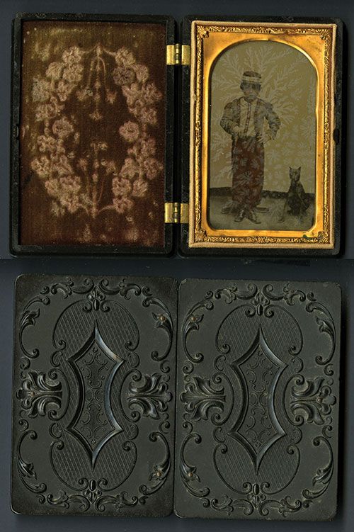 ND, (ca.1860-65), 2.5 x 3.6 inch Gutta Percha case in black in excellent condition with gold-copper frame surrounding ambrotype photograph of young boy in uniform with hand on cane or sword with dog sitting.