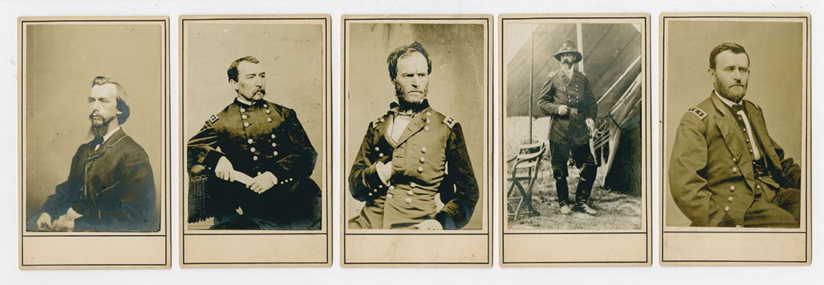 Civil War CDV Lot of 5 Photographs by Meserve, Includes 5 photographs of U.S. Grant; William T. Sherman; George G. Meade; Philip Sheridan all in uniform and John G Nicolay. All are 2.25 x 4 inches, Backs have printed "Collection of Americana - Frederick Hill Meserve - New York" and name of photo subjects written in pencil in Meserve's hand. All are in exceptional condition. Frederick Hill Meserve (1865 – 1962) was a businessman and collector of photographs. He published a large collection of early American photographic portraits. In 1944 he worked with historian Carl Sandburg to publish 100 photographs of Abraham Lincoln. The Library of Congress has his photographic publishing's in its collection. His father William Neal Meserve was a veteran of the American Civil War. (Ex. John E. Herzog Collection, June 12, 1997, R.M Smythe)