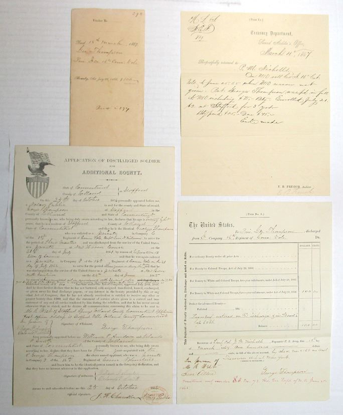 Connecticut. Lot of 4 Documents Pertaining to George Thompson and his service during the Civil War, Includes: 1866 Form No. 5 for a George Thompson from Stafford Connecticut in 1866 for information on bounty for White or Colored Troops from 1 to 3 year enlistments with Thompson's signature; Included is Additional Discharge for Additional Bounty with reason of discharge was "Termination of War"; and letter from Ezra B French, who was appointed Second Auditor of the Treasury August 3, 1861, by President Abraham Lincoln, and continued during the administrations of Presidents Andrew Johnson, Ulysses S. Grant, and Rutherford B. Hayes. Also included is the envelope documents were enclosed in. Documents are in VF to XF condition. (4). Sold "AS IS" no returns accepted