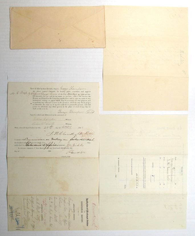 Connecticut. Lot of 4 Documents Pertaining to George Thompson and his service during the Civil War, Includes: 1866 Form No. 5 for a George Thompson from Stafford Connecticut in 1866 for information on bounty for White or Colored Troops from 1 to 3 year enlistments with Thompson's signature; Included is Additional Discharge for Additional Bounty with reason of discharge was "Termination of War"; and letter from Ezra B French, who was appointed Second Auditor of the Treasury August 3, 1861, by President Abraham Lincoln, and continued during the administrations of Presidents Andrew Johnson, Ulysses S. Grant, and Rutherford B. Hayes. Also included is the envelope documents were enclosed in. Documents are in VF to XF condition. (4). Sold "AS IS" no returns accepted