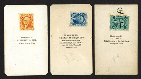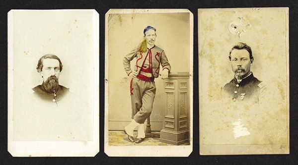 United States. CDVs of Civil War soldiers. Photographer imprints on back from Watertown, WI (man with full beard); Springfield, OH (tack hole and dirty) and Trenton, NJ (standing figure with red and blue painted highlights). Different revenue stamps on back of each. 3 pieces.