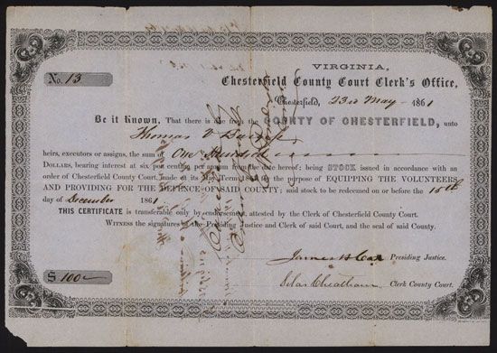 Chesterfield County, Virginia, 1861, $100, 6% Issued and Cancelled Bond, #13, Dark blue print on light blue paper with ornate border and no vignette, Fine condition with small piece missing from lower left corner and fine splits on folds, Ritchie & Dunnavant Print.