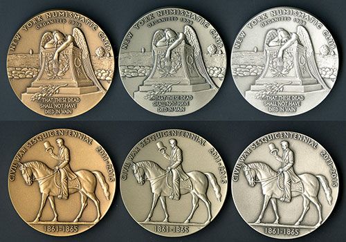 Lot of 3 medals, all from NY Numismatic Coin Club, Includes 4.4 ounce .999 Silver medal, bronze medal and one other medal, All with same design. All are in CU condition. Rare set #6.