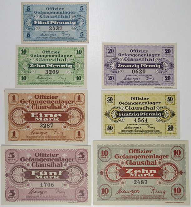 Clausthal , Germany. Lot of 7 Officer, Prisoner of War Notgeld Scrip notes includes 10 Mark; 5 Market; 1 Mark; 50 Pfg; 20 Pfg; 10 Pfg; and 5 Pf. The latter VF, while the rest are Choice to Gem Unc. Light pencil annotation on reverse of 10 Mark. (7)