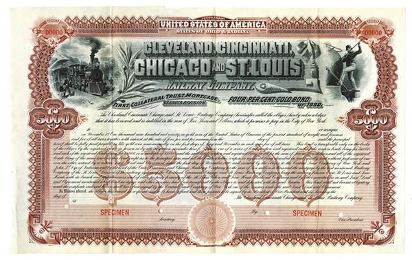 Ohio & Indiana. $5000 Specimen 4% 1st Collateral Trust Mortgage Gold Bond, Black print on brown border and under tint in horizontal format, Porter pushing luggage cart away from locomotive at left and man repairing engine at right, Specimen overprints and POC's, Fine-VF condition, FBNC. Rare as specimen.