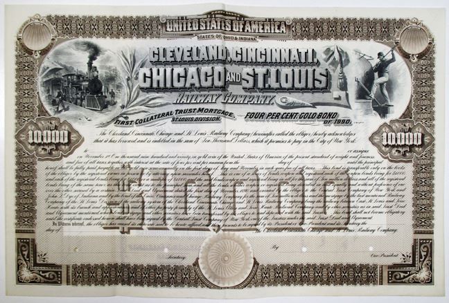 OH & IN 1890. $10,000 Specimen 4% Registered First Collateral Trust Mortgage Gold Bond, St. Louis Division. Black text with brown border and underprint, Train passing station at top left, Man cleaning boiler at top right. POCs, VF condition, FBN.