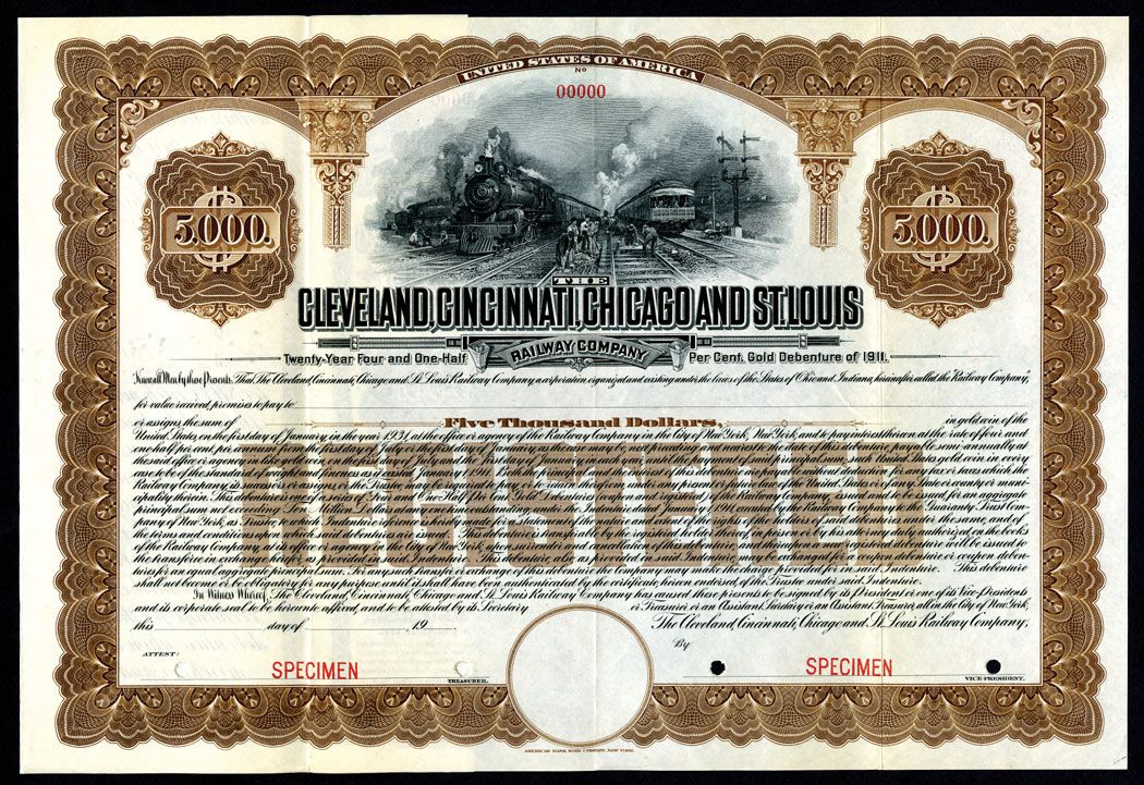 Ohio & Indiana, 1911, $5000 Registered 4 1/2% Gold Specimen Bond, Horizontal format, Black on brown border and underprint, locomotives passing workers, POC's, XF condition, ABNC. Unlisted bond variety, denomination and color in Cox.