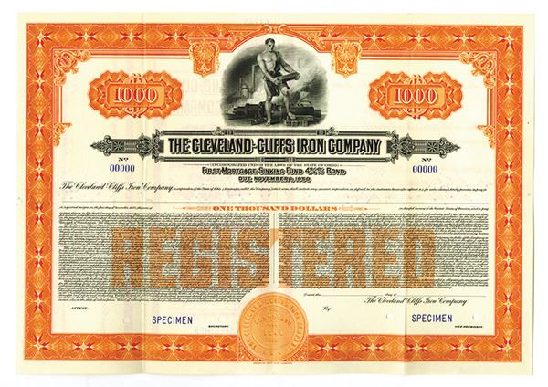 Ohio, 1937, $1000, 1st Mortgage Sinking Fund 4 3/4% Bond, Specimen Bond, Black on orange border and under print, Semi-nude allegorical man holding iron block in iron smelter top center, VF-XF condition, ABNC.