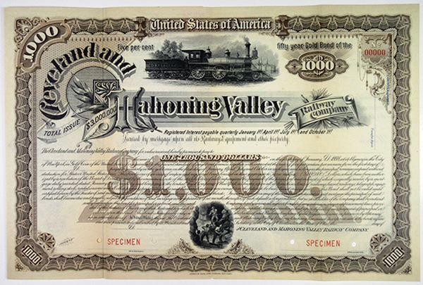 Ohio. $1000 Specimen 5% Gold Bond, Black text with brown border and underprint, Illustration of "America" train passing on tracks at top. Red specimen overprints, "00000" serial number and POC's, VF condition with minor splitting at bottom, ABNC. Only known as a specimen in Cox, no issued examples known.