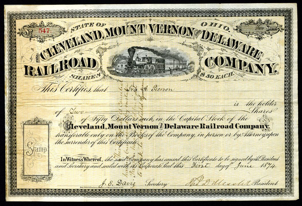 Ohio, 2 Shares, I/C, Locomotive R-L on curve past Roman building, Black on tan underprint, VF.