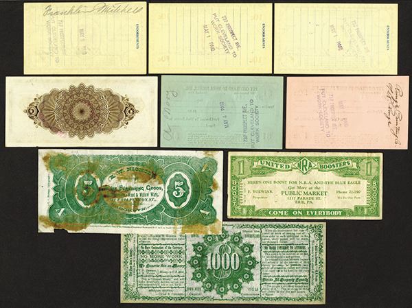 OH. Put Cleveland to Work Society, 5, 10, 25, 50 Cents, 1 Dollar. Issued and endorsed. Tear on the $1; NJ. Borough of Westville. $5. 1933 Ad Notes for NRA featuring Roosevelt, E.W. Nichols, House Furnishing, Fulton St. Brooklyn (1873) stained; 1969 Joseph Shortino satirical note. 9 pieces.
