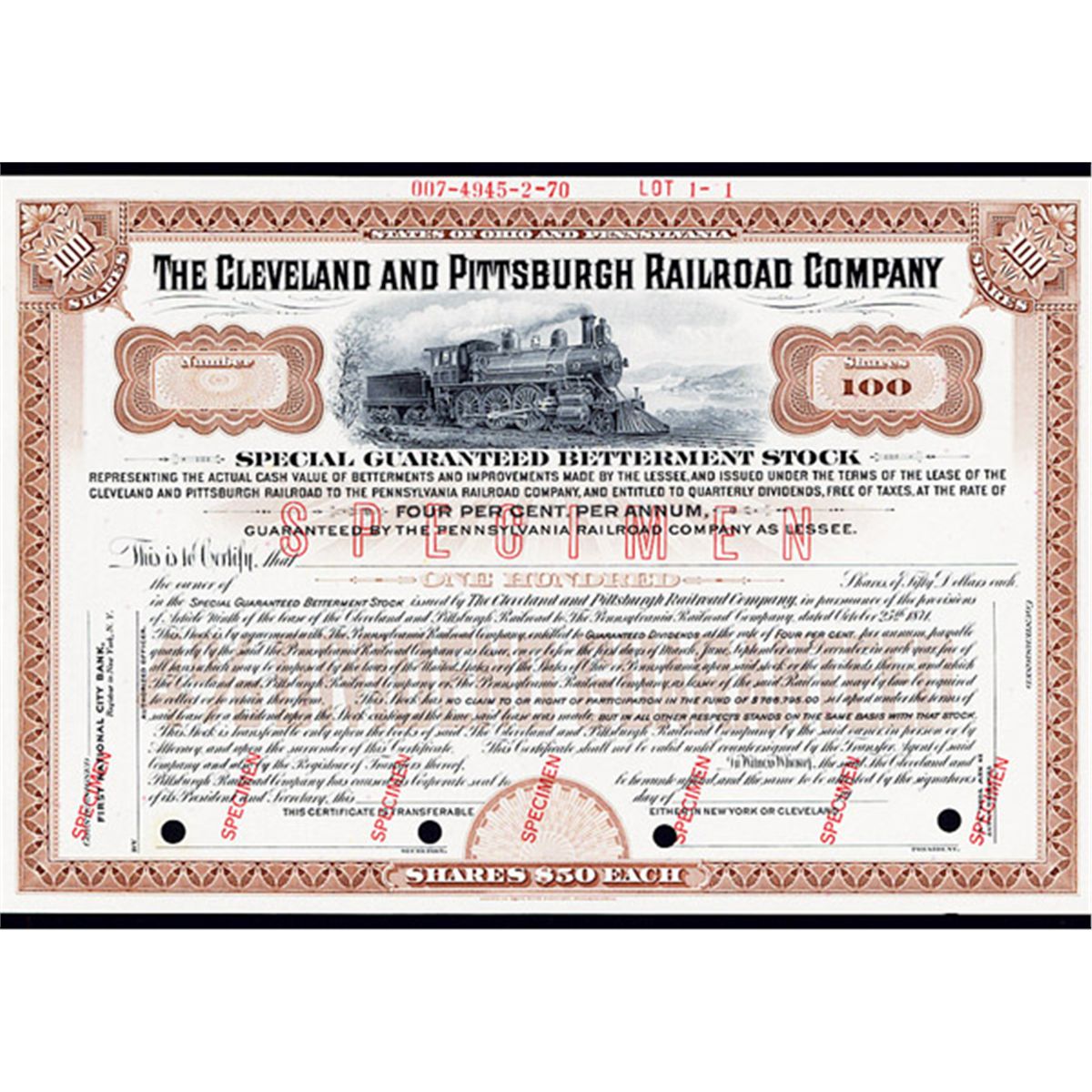 Ohio & Pennsylvania, ND (ca.1890-1900), 100 Shs., Four Per cent Per Annum Guaranteed by the Pennsylvania Railroad, Specimen, Locomotive, Brown, POC's, XF. ABNC.