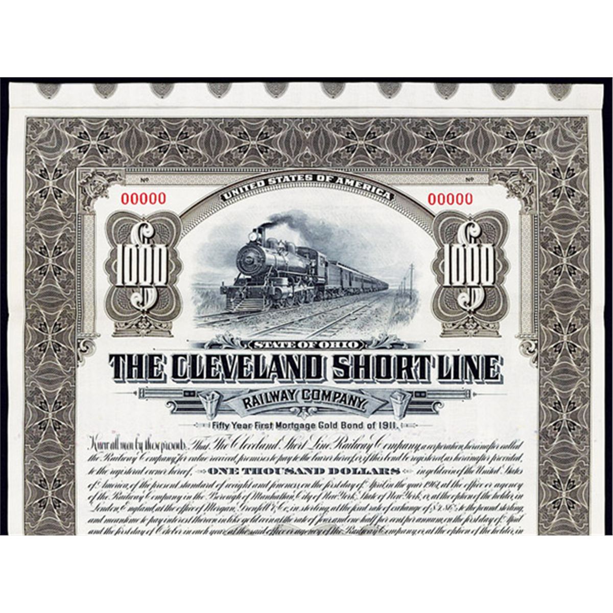 Ohio, 1911, $1000, Specimen bond, Locomotive passing telegraph poles, Brown, ABNC, POC's, XF.