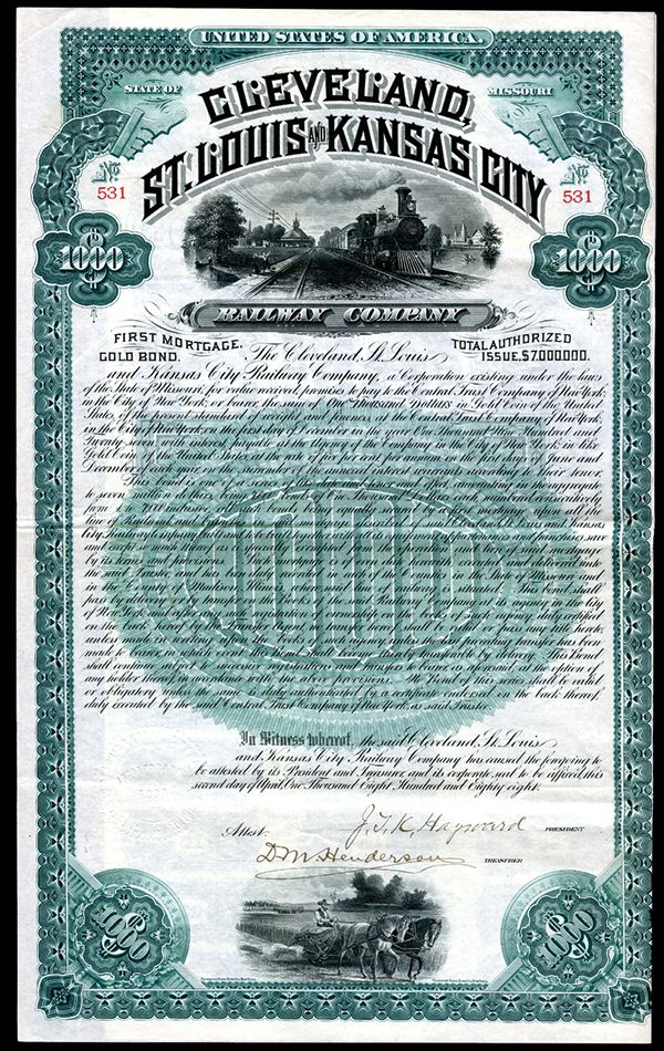 Cleveland, St. Louis and Kansas City Railway Co, 1888, Issued Coupon Bond. Missouri (Ohio). $1000, 5% Gold Coupon Bond, coupons attached, black on green border and underprint, Locomotive almost straight on, VF condition, attractive and scarce bond. Franklin BNC.